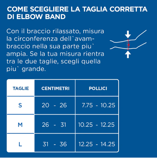 ELBOW BAND è un supporto composto da una gomitiera a fascia di tipo leggero che consente mediante la compressione, localizzata sotto l’inserzione del tendine laterale (lato esterno) o mediale (lato interno), di ridurre la corsa dei tendini del gomito, di assorbire le sollecitazioni e di conseguenza riduce l’infiammazione e il dolore. Prodotto molto leggero e confortevole.