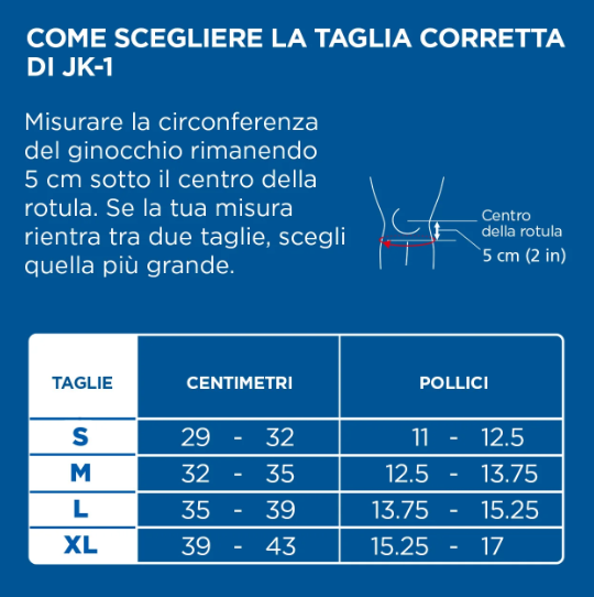 JK-1 è un supporto ginocchio atto ad assorbire gli urti e le vibrazioni della rotula e a stabilizzarla, è l’ideale sia per la tendinite rotulea che per lesioni connesse alla rotula e ai menischi, è adatto inoltre ad atleti e sportivi che soffrono di borsite del tendine rotuleo o della sindrome di Osgood-Schlatter.